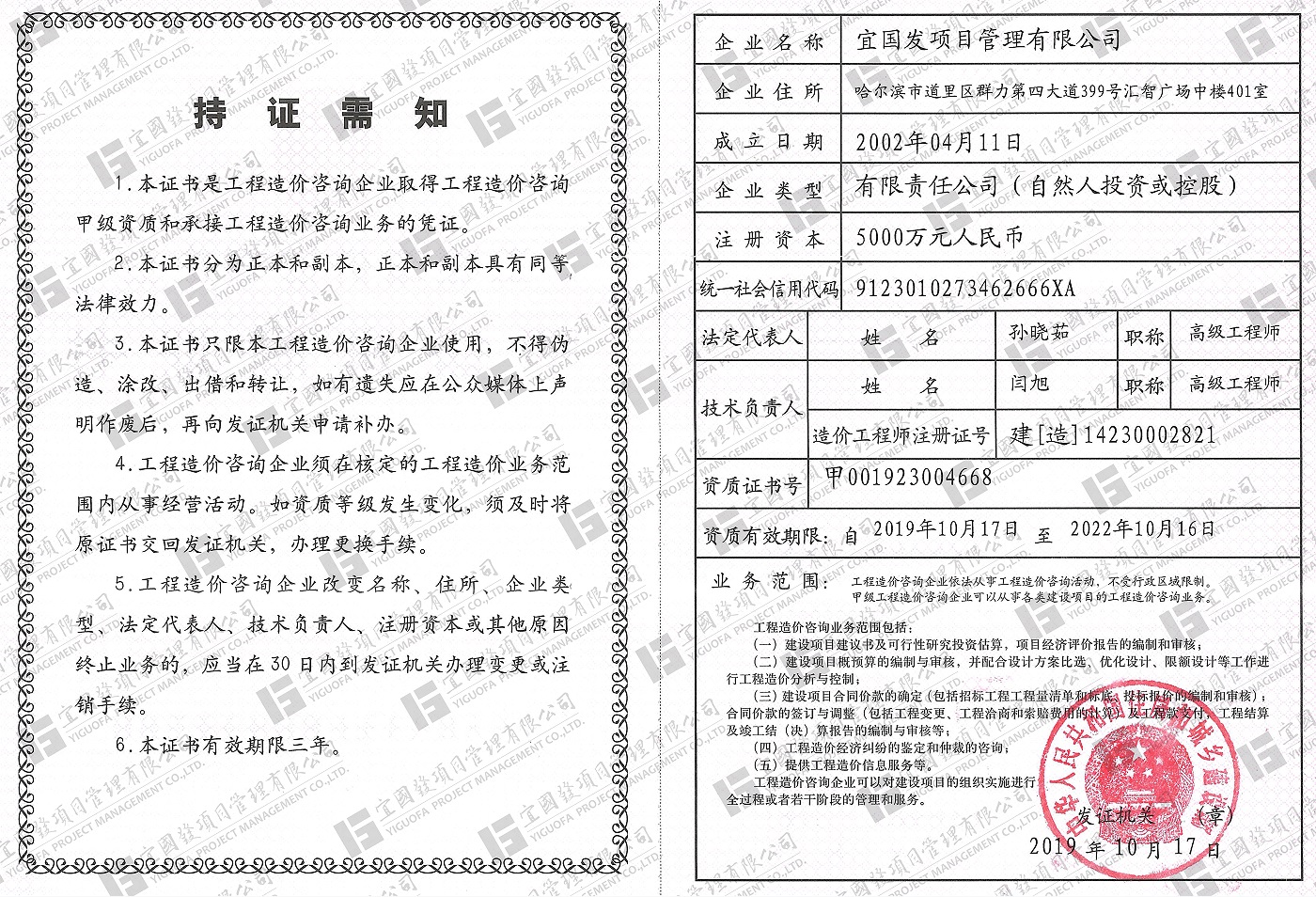 宜國發項目管理有限公司(原名黑龍江國發項目管理有限責任公司)成立于2002年4月,公司注冊資金5000萬元人民幣,具有獨立法人資格?,F具備國家住房和城鄉建設部頒發的工程招標代理機構甲級資質,發展和改革委員會頒發的中央投資項目招標代理機構甲級資質、財政部頒發的政府采購代理機構甲級資質,黑龍江省住房和城鄉建設廳頒發的工程造價咨詢企業甲級資質,并已納入全國投資項目在線審批監管平臺工程咨詢單位備案名單、“中國政府采購網”政府采購代理機構名單及“中國國際招標網”機電產品國際招標代理機構名單,且通過了質量管理體系、環境管理體系、職業健康安全管理體系認證。